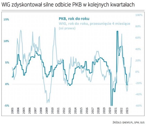 Przyglądając się wykresowi zestawiającemu wahania realnego produktu krajowego brutto z roczną dynamiką WIG-u, nietrudno oprzeć się wrażeniu, że w poprzednich latach krajowy rynek akcji perfekcyjnie dyskontował z wyprzedzeniem – które można szacować na umowne cztery miesiące – zarówno postpandemiczny boom ekonomiczny, jak i późniejsze ostre hamowanie, które w I kwartale br. zepchnęło roczną zmianę PKB do -0,3 proc.