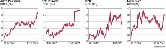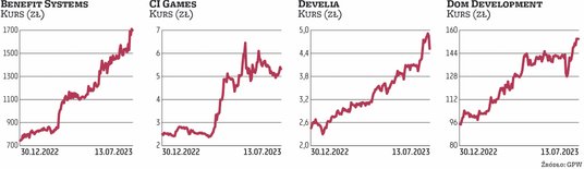 Prym wśród średnich spółek wiedli także deweloperzy mieszkaniowi, których wyceny pną się w górę niemal nieprzerwanie od jesieni 2022 r. W ścisłej czołówce pod względem stóp zwrotu liczonych od początku 2023 r. znalazły się papiery Develii i Domu Development.