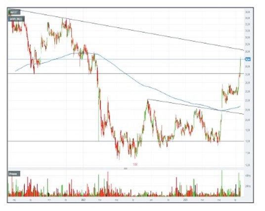 Z perspektywy analizy technicznej wygląda na to, że popyt w okolicach 18 zł znalazł mocne wsparcie, które wytrzymało serię tegorocznych testów. W maju kurs wybił opór w postaci dołka ze szczytu z II połowy zeszłego roku. Po kilku tygodniach trendu bocznego mamy kolejną odsłonę podobnie dynamicznej fali wzrostowej. Efekty już są okazałe – popyt sforsował opór w postaci dołka z połowy 2021 r. i dalej kieruje się na północ. Do szczytów z 2021 r. wciąż daleko.