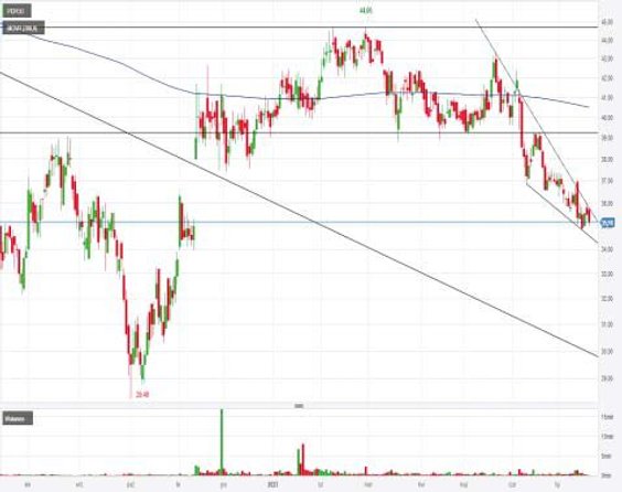 Warto odnotować wyraźny wzrost obrotów przy zejściu kursu między 35 a 36 zł i jednoczesną reakcję popytu (1,8 proc.). Jak zwrócił uwagę Michał Pietrzyca z DM BOŚ, obrót we wtorek odpowiadał 0,72-krotności średniej miesięcznej wymiany. – Co ciekawe, walor ten uzyskał pozytywny słupek japoński przenikania hossy, który potwierdził ważne wsparcie 34,90 zł. Niemniej wg DMI/ADX nadal mamy dominującą tendencję spadkową, stąd warto pilnować strefy popytowej 34,90–34,18 zł – analizował. – Z drugiej strony w ostatnich dniach kurs Pepco wybił się dołem z klina zniżkującego, a teraz próbuje powrócić do jego wnętrza. Zatem przejście od dołu bariery 35,73 zł powinno wymuszać większą aktywność graczy i generować schemat 2B z opcją wejścia w życie dynamicznej kontry byków na RSI/CCI (14). Warto również zwrócić uwagę na linię półtorarocznego trendu spadkowego, która wypada w rzucie pionowym przy około 40,70 zł – podpowiadał Pietrzyca. Jego zdaniem od zachowania strefy popytowej 34,90 – 34,18 – 33,22 zł zależy, czy byki uzyskają poszerzony zakres zmienności w najbliższych tygodniach handlu.