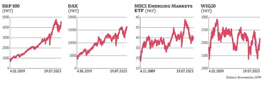 Zdecydowanie mniejszy optymizm panował na głównych giełdach naszego kontynentu. Wyjątkiem był londyński FTSE 250, który skoczył aż o ponad 4 proc. To zasługa lepszych, niż się spodziewano, danych makroekonomicznych oraz cofania się inflacji, szczególnie inflacji bazowej. Indeks giełdy niemieckiej nie zmienił wartości, ale od początku roku zyskuje niemal 16 proc. O 0,7 proc. w dół szedł do środy paryski CAC40. Korektę, sięgającą 0,8 proc., zaliczył indeks rynków wschodzących, ale trzeba pamiętać, że tydzień wcześniej rósł o ponad 4 proc. Od początku roku MSCI Emerging Markets rośnie o nieco ponad 13 proc., a więc na tle głównych giełd światowych nie błyszczy. Głównym powodem jest słabe zachowanie giełdy chińskiej. Shanghai Composite od początku roku zyskuje zaledwie 3 proc., a do czwartku tracił 1,5 proc. Jeszcze gorzej radzi sobie parkiet w Hongkongu, gdzie do czwartku indeks zniżkował o ponad 2 proc., a od początku roku traci 4 proc.