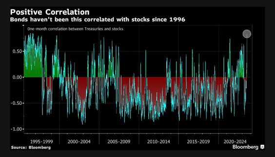 Jednomiesięczna korelacja jest obecnie najwyższa od 1996 r., kiedy to niska inflacja w połączeniu z silnym wzrostem krajowym doprowadziła do umocnienia obu klas aktywów.