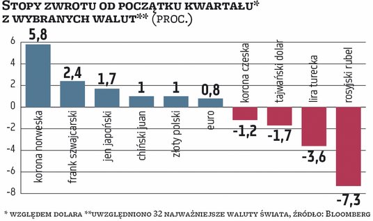 Fatalną passę nawet w lepszym od jena stylu przerwała norweska korona. Dzięki zwyżkom cen ropy skandynawska waluta plasuje się na szczycie najsilniejszych walut trzeciego kwartału (ramka 6). Dna rankingu nie opuszczają jednak turecka lira oraz rosyjski rubel. Choć bank Turcji zaprezentował bardziej realne prognozy inflacji, to walucie znad Bosforu ciąży fakt, że nadal zamierza ona zaostrzać politykę bardzo powoli.