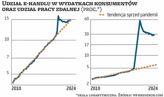 Na koniec skutkom pandemii przyjrzyjmy się w nieco szerszym kontekście. Jak zauważa Piotr Żółkiewicz z Zolkiewicz & Partners, po zawirowaniach z ostatnich lat do przedpandemicznej tendencji powrócił e-handel w USA. Jego udział w krajowym handlu detalicznym sięgnął 15 proc. i nadal rośnie, co potwierdzają widoczne w raportach kwartalnych dynamiki przychodów takich gigantów jak Amazon czy Paypal. Powrotu do dawnych tendencji nie widać jednak w przypadku pracy z domu.