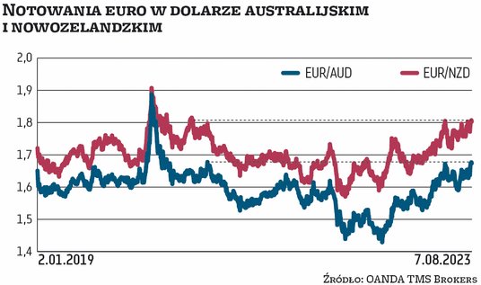 – Słaba od ubiegłego roku koniunktura na rynkach surowców i klapa ożywienia w gospodarce Państwa Środka (w lipcu import spadł o 12,4 proc., czyli najmocniej od lutego 2020 r.) negatywnie wpływa na dolara australijskiego i nowozelandzkiego. Od 2022 r. obie waluty osłabiają się względem euro. Kursy EUR/NZD i EUR/AUD są już najwyżej od 2020 r., co daje nadzieję na kontynuację tej tendencji w najbliższych miesiącach – komentuje analityk.