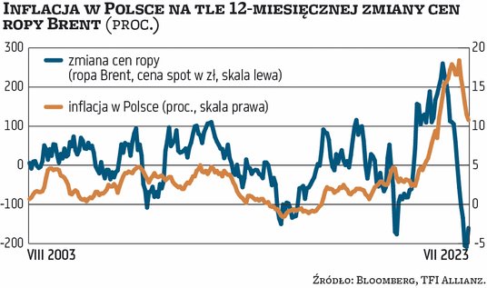 Wokół scenariuszy dla inflacji nie ma jednak konsensu, bo zupełnie inaczej – przynajmniej w przypadku Polski – jej perspektywy widzi Adam Łukojć z TFI Allianz. Wyrażona w złotych roczna zmiana cen ropy Brent była tradycyjnie silnie skorelowana z inflacją w kraju. To jednak zmieniło się jesienią 2021 r., czyli tuż przed wybuchem inflacji.