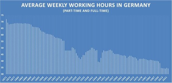 W obliczu rosnącego zapotrzebowania na wykwalifikowanych pracowników, coraz częściej mówi się o wydłużeniu czasu pracy. W ostatnich latach odsetek ten nieznacznie spadł w przypadku pracowników zależnych zatrudnionych w pełnym wymiarze czasu pracy: ze średnio 40,6 godzin normalnie przepracowanych tygodniowo w 2010 r. do 40,0 godzin w 2022 r. Jak podaje również Federalny Urząd Statystyczny (Destatis), nastąpił wzrost liczby godzin przepracowanych przez niesamodzielnych pracowników zatrudnionych w niepełnym wymiarze czasu pracy: w zeszłym roku przepracowali oni średnio 21,2 godziny tygodniowo, więcej niż w 2010 r. W tym czasie przeciętny czas pracy wynosił 18,4 godziny tygodniowo. Ze względu na tę przeciwstawną tendencję średni tygodniowy czas pracy wszystkich pracowników zależnych zmienił się niewiele w tym samym okresie: spadł z 34,7 godziny w 2010 r. do 34,3 godziny w 2022 r. Jedynie w Danii i Holandii ludzie pracują jeszcze mniej, co wynika z wysokiego odsetka osób pracujących w niepełnym wymiarze czasu pracy w obu krajach. Od 1991 r. tygodniowy czas pracy w Niemczech spadł o 4,1 godziny, z 38,4 godzin.