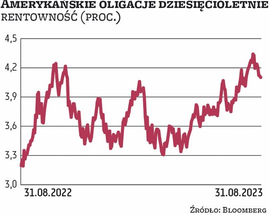 22 sierpnia doszła do poziomu 4,366 proc. – była wyższa niż w szczycie z października 2022 r. i zarazem najwyższa od listopada 2007 r. Osiągnęła taki poziom na dzień przed wystąpieniem Jerome’a Powella, szefa Fedu, na sympozjum w Jackson Hole. 31 sierpnia po południu rentowność amerykańskich dziesięciolatek wynosiła już jednak tylko 4,1 proc. Wróciła do poziomu z pierwszej połowy sierpnia.