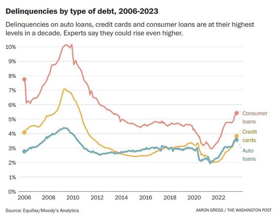 Eksperci kredytowi twierdzą, że zaległości w spłatach kredytów samochodowych, które osiągnęły już najwyższy poziom odnotowywany ostatnio podczas kryzysu finansowego pod koniec pierwszej dekady XXI w., również będą prawdopodobnie nadal rosły. Sytuacja jest jeszcze gorsza w przypadku kredytobiorców ze złym kredytem, których pożyczki są uważane za „subprime” w żargonie Wall Street. Podczas kryzysu finansowego 5 proc. kredytobiorców subprime miało opóźnienia w spłacie kredytów o co najmniej 60 dni; według danych Equifax obecnie jest to blisko 7 proc.