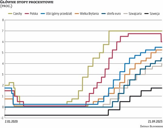 Czy kluczowe banki centralne zakończyły już cykle zacieśniania polityki pieniężnej? Nawet jeśli niektóre z nich zastrzegają, że mogą jeszcze podwyższyć stopy, to inwestorzy i tak są przekonani, że koniec cyklu jest bardzo blisko. Tak jest choćby w przypadku amerykańskiego Fedu. W środę wieczorem utrzymał on główną stopę procentową w przedziale 5,25–5,5 proc. Przedstawił też projekcje członków Komitetu Otwartego Rynku (FOMC) wskazujące, że przed końcem roku dojdzie do jednej podwyżki.