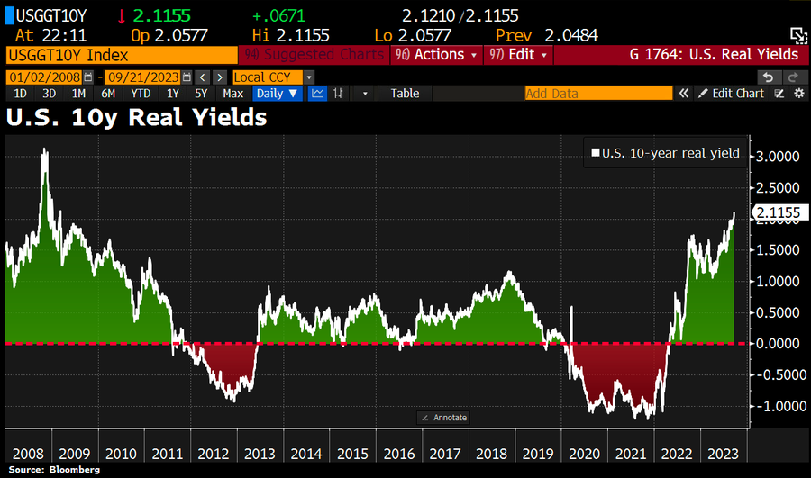 Benchmarkowa rentowność 10-letnich amerykańskich obligacji skarbowych wzrosła w czwartek do najwyższych poziomów od 16 lat, dzień po tym, jak Rezerwa Federalna zaskoczyła inwestorów, sygnalizując potencjał dodatkowej podwyżki stóp procentowych i spodziewając się mniejszej liczby obniżek w przyszłym roku. A realne rentowności (10-letnie rentowności nominalne – 10-letnie oczekiwania inflacyjne) wzrosły do 2,11 proc., najwyższego poziomu od 2009 roku.