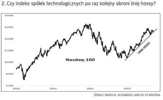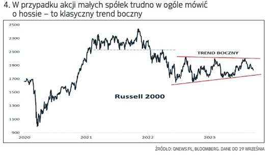 Pozostawiając już na boku tegoroczne osiągnięcia poszczególnych indeksów, przyjrzyjmy się bardziej długoterminowej sytuacji na ich wykresach. Technologiczny NDX zdołał odrobić większość strat z ubiegłorocznej bessy, ale sierpniowo-wrześniowa korekta zatrzymała, jak na razie, jego marsz w kierunku rekordu. Póki co ta korekta, choć najgłębsza od czasu rozpoczęcia tegorocznej dynamicznej zwyżki, nie wyrządziła całemu trendowi wzrostowemu dramatycznych szkód. Warto jednak trzymać rękę na pulsie, bo w momencie pisania tego artykułu NDX testuje linię hossy łączącą wszystkie tegoroczne lokalne dołki.