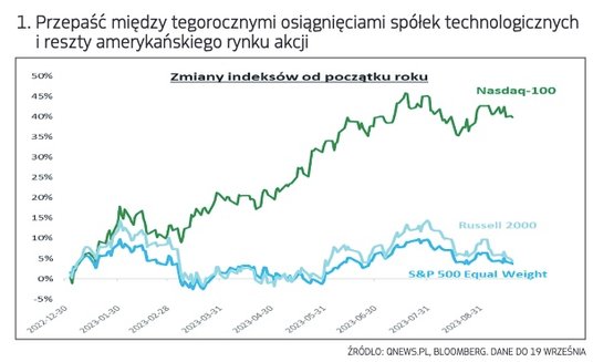 Z jednej strony mamy technologiczne giganty, które w naszym porównaniu reprezentuje indeks Nasdaq 100. A z drugiej – całą resztę rynku. Pokazujemy ją przez pryzmat wersji indeksu S&P 500 o równych wagach poszczególnych spółek (Equal Weight, dalej: SPW), czyli takiej, na którą technologiczna „elita” nie ma istotnego wpływu. Pomocniczo do tego porównania dodajemy też indeks małych spółek Russell 2000.