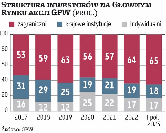 Równocześnie zmniejszało się znaczenie drobnych graczy, którzy są istotną siłą w handlu walorami mniejszych spółek. Według danych warszawskiej giełdy w I połowie 2023 roku na głównym rynku akcji udział inwestorów z zagranicy w obrocie wyniósł 65 proc., o 2 pkt proc. więcej w porównaniu z analogicznym okresem poprzedniego roku. Był to najwyższy udział w pierwszym półroczu w ciągu ostatnich dziesięciu lat. W tym samym czasie krajowi inwestorzy indywidualni wygenerowali jedynie 17 proc. obrotów, o 1 pkt proc. mniej niż w ubiegłym roku. Z kolei krajowi inwestorzy instytucjonalni odpowiadali za 18 proc. obrotów, o 1 pkt proc. mniej niż w pierwszej połowie 2022 r.