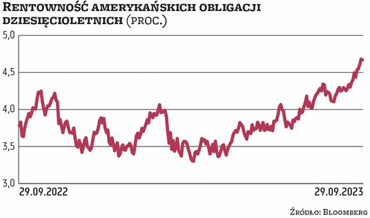 Na razie każdy kolejny dzień tego tygodnia przynosi wzrost rentowności (spadki cen) amerykańskich obligacji skarbowych. W czwartek po południu oprocentowanie tamtejszych papierów dziesięcioletnich sięgało już 4,67 proc. wobec 3,879 proc. na zamknięciu 2022 r. oraz 1,51 proc. na zamknięciu 2021 r. Poprzednio tak wysoko wskaźnik ten znajdował się kilkanaście lat temu. ETF-y amerykańskich obligacji długoterminowych po około 30-proc. przecenie w zeszłym roku w tym notują już około 10-proc. spadki. Główną przyczyną przeceny amerykańskiego długu są rosnące obawy przed utrzymaniem ostrego kursu w polityce monetarnej Fed.