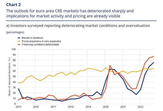 W ciągu ostatniej dekady niektóre banki europejskie zaczęły udzielać kredytów na rynku nieruchomości komercyjnych, aby zwiększyć przychody, ponieważ ujemne stopy procentowe zmniejszyły rentowność. Jednak ta klasa aktywów mocno ucierpiała ze względu na wzrost liczby pracy w domu i zakupów online podczas pandemii, a szybkie podwyżki stóp procentowych jeszcze bardziej obniżyły popyt. Ceny już spadły w USA i Wielkiej Brytanii i zaczęły spadać na rynkach strefy euro, w tym w Niemczech.