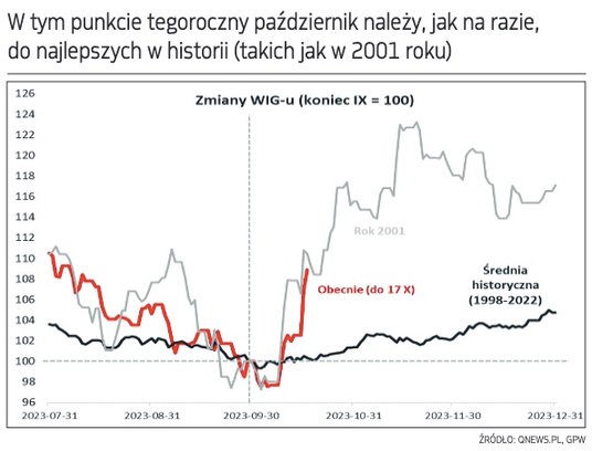 W momencie pisania tego artykułu (tzn. po sesji 17 X) WIG był 8,9 proc. na plusie od początku października. Okazuje się, że tak pokaźna zwyżka w tym punkcie dziesiątego miesiąca roku plasuje go, jak na razie, wśród najlepszych w całej historii. Z naszych ustaleń wynika, że wyższy wzrost WIG-u w tym punkcie października odnotowano wcześniej… 20 lat temu (2003 rok). Z kolei rekordzistą pod tym względem był październik 2001, ze zwyżką +10,5 proc. po 17 dniach miesiąca (widać więc, że do tamtego rekordu niewiele brakuje). Ciekawostką jest fakt, że zachowanie WIG-u w ostatnich miesiącach jest niezwykle zbliżone właśnie do tego z 2001 roku. Gdyby ta analogia miała się utrzymać, to należałoby założyć, że w końcówce roku istnieje jeszcze ciągle spory potencjał (oczywiście 2001 rok miał swoją niepowtarzalną specyfikę – globalne rynki otrząsały się wtedy po szoku związanym z atakiem na wieże WTC).
