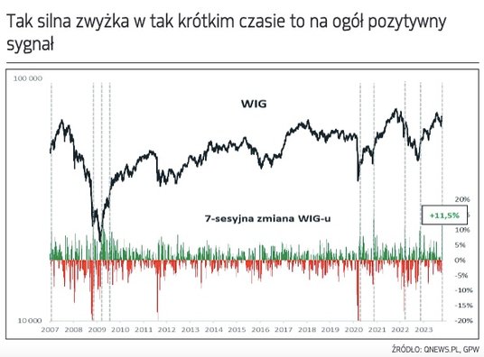 Uwagę warto zwrócić na fakt, że dyskontowanie możliwego zwycięstwa prounijnej opozycji rozpoczęło się na warszawskiej giełdzie już na kilka dni przed samymi wyborami. Jeśli wziąć pod uwagę zarówno pierwsze dwie entuzjastyczne sesje po elekcji i wcześniejsze pięć bardzo udanych przedwyborczych dni, to okazuje się, że taka łączna, 7-sesyjna zwyżka WIG-u wyniosła aż 11,5 proc. Z historycznego punktu widzenia takie tempo nie jest zbyt często spotykane (w ostatnich kilku latach, od czasu pandemii, wyraźnie częściej).