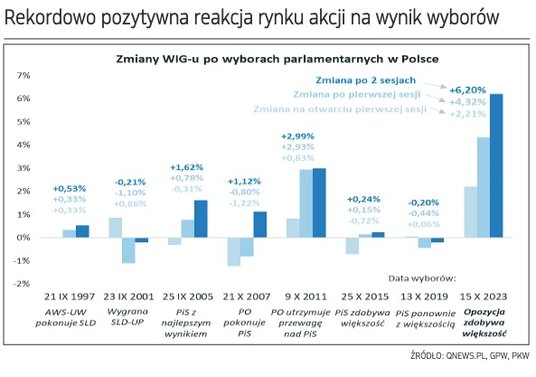 Najbardziej zbliżona do tych wyników była zwyżka WIG-u po wyborach w październiku 2011, w wyniku których PO zdołała utrzymać przewagę nad PiS, jednak wtedy o wzroście zdecydowała w niemałym stopniu równoległa mocna poprawa sytuacji na rynkach globalnych. Przy braku takiego mocnego ożywienia tym razem należy się jeszcze większe uznanie dla pierwszej reakcji krajowej giełdy.