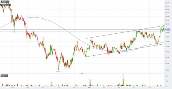 Akcje ING Banku Śląskiego od początku tego roku zyskały blisko 25 proc. wobec blisko 50-proc. zwyżki WIG-banki. W październiku akcje banku wybiły się na nowe w tym roku szczyty, docierając na moment do 215 zł. ING wybił się w ten sposób powyżej lipcowych szczytów. Wówczas kurs zatrzymał się w okolicach 205 zł. Październik może być najlepszym jak dotąd miesiącem dla udziałowców ING - kurs zyskał już około 15 proc. Jak dotąd najwięcej akcje ING rosły w czerwcu i było to 15 proc.