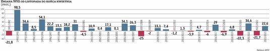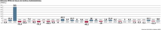 WIG jest obliczany od 16 kwietnia 1991 r. Ma charakter dochodowy, co oznacza że przy jego obliczaniu uwzględnia się zarówno ceny zawartych w nim akcji, jak i dochody z dywidend i praw poboru. Pierwsza wartość indeksu wynosiła 1000 pkt. Porusza się on w długoterminowym trendzie wzrostowym. Pierwszy szczyt na poziomie ponad 20 tys. pkt zanotował podczas hossy w 1994 r. Następnie gwałtownie spadł, a w kolejnych latach odrabiał straty, znów przebijając poziom 20 tys. pkt w 2000 r., czyli zanim pękła tzw. bańka internetowa. Potem od 2004 r. znów zaczął piąć się w górę,wyznaczając nowe maksimum w 2007 r. na poziomie ponad 60 tys. pkt. Globalny kryzys finansowy, który wybuchł na rynkach w kolejnych kwartałach, znów sprowadził indeks do wspomnianego już poziomu 20 tys. pkt w lutym 2009 r. i było to dno ówczesnej bessy. Od tego czasu zaczął się systematyczny ruch indeksu w górę, choć nie zabrakło też mocnych spadkowych korekt. Bardzo dużą zmienność na rynkach widać było m.in. po wybuchu pandemii w I kwartale 2020 r. Późniejsze mocne odbicie wyniosło indeks na nowe rekordowe poziomy. Jesienią 2021 r. podczas sesji 8 listopada przebił poziom 75 tys. pkt – i to jest dotychczasowe historyczne maksimum. Żeby ustanowić nowe, indeks musiałby urosnąć o niespełna 9 proc. Przy sprzyjającej sytuacji na globalnych rynkach jest to poziom, który wydaje się być całkiem realny. Przy czym warto odnotować, że ta relatywnie niewielka przestrzeń dzieląca WIG od ustanowienia nowego rekordu utrzymuje się już od kilku miesięcy. Indeks zaczynał 2023 r. od poziomu 57–58 tys. pkt, a w lipcu udało mu się nawet przebić pułap 70 tys. pkt, ale szybko spadł poniżej. Zachowanie indeksu w dużej mierze zależeć będzie od kilku blue chips. Największy pakiet w portfelu WIG mają aktualnie akcje dwóch spółek z udziałem Skarbu Państwa w akcjonariacie: Orlenu oraz PKO BP. Na każdą z nich przypada ponad 10 proc. portfela indeksu. W s umie firmy kontrolowane przez SP mają w WIG ponad 42-proc. udział – wynika z naszych szacunków. Choć to WIG nazywany jest głównym indeksem GPW, to inwestorzy zagraniczni (generują większość obrotu akcjami na GPW) patrzą raczej na WIG20. Ten jest zależny od spółek SP w jeszcze większym stopniu niż WIG.