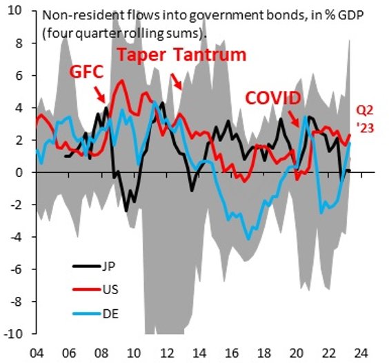 Stany Zjednoczone nie powinny narzekać na brak nieelastycznych cenowo nabywców obligacji skarbowych, co jest głównym powodem wzrostu rentowności w długim terminie. Napływy zagraniczne do obligacji skarbowych (czerwone) – uważane za nieelastyczne cenowo – są duże. – Prawda jest prostsza. Mamy ogromny deficyt. Te winduje rentowności – podkreśla Robin Brooks, główny ekonomista IIF (Institute of International Finance – Instytutu Finansów Międzynarodowych).