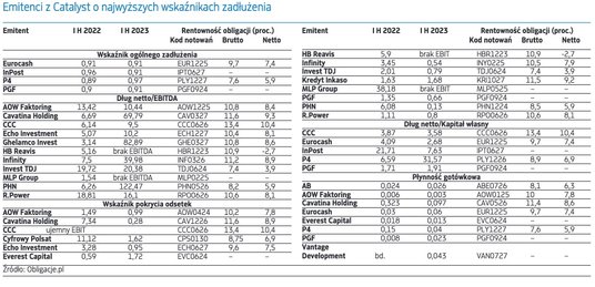 Jednocześnie wzrosły – i tu już trudno znaleźć na całym Catalyst wyjątki – koszty odsetkowe, które niełatwo było nadrobić odpowiednio wysokim przyrostem zysków operacyjnych. Wobec tego wzrosła także liczba emitentów, która na papierze wykazała kłopoty z wypracowaniem zysków pozwalających na obsługę zadłużenia (nie wspominając o jego spłacie w przyszłości). Nie zawsze obecność w tym zestawieniu jest „sprawiedliwa”. Np. Kredyt Inkaso osiąga coraz lepsze wskaźniki pokrycia długu zyskiem EBITDA gotówkowa i generuje dość wpływów, by swoje zobowiązania redukować. W praktyce do każdego emitenta można i należy przykładać indywidualną, a nie uniwersalną miarę. Jednak wówczas takie zestawienia nie mogłyby powstać.