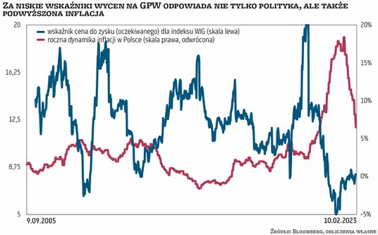Nie oznacza to jednak, że winę za niskie wskaźniki wycen na krajowej giełdzie można przypisać jedynie czynnikom politycznym. Swoją rolę odegrała też wysoka inflacja nękająca nasze oszczędności w minionych dwóch latach, a zmiana partii rządzącej wcale nie musi oznaczać jej rychłego spadku do celu inflacyjnego NBP. Dlatego uważam, że droga powrotu wskaźnika C/Z dla indeksu WIG do historycznej średniej (11–12) z obecnego poziomu 8 może okazać się długa i wyboista (wykres 1). Zwłaszcza że jak tylko Chiny lub inne rynki wschodzące (w tym być może Rosja) powrócą do łask inwestorów, Polska może zniknąć z radarów dużej części z nich.