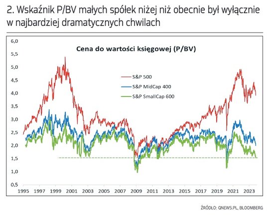 A jeśli sięgnąć po inny klasyczny wskaźnik wyceny, czyli cenę do wartości księgowej (P/BV), to akcje z S&P 500 wyglądają ciągle na drogie z długoterminowego punktu widzenia. P/BV przekracza 4. Dobrze, że nie jest to już ok. 5, czyli wartość odnotowana na szczycie przed ubiegłoroczną bessą, ale przypomnijmy, że po wybuchu pandemii P/BV zjechał w okolicę 2,5 – i dopiero takie wartości historycznie można było określać jako okazyjne.