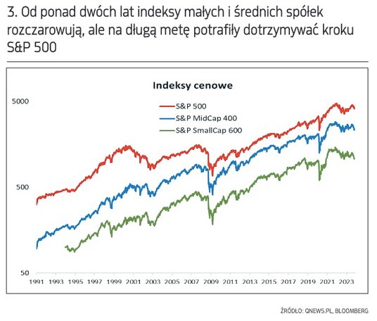 Właśnie w oparciu o takie dane biorą się zarzuty o to, że amerykańskie akcje są, mniej lub bardziej, drogie. Okazuje się jednak, że te zarzuty stają się zupełnie bezpodstawne, jeśli przestaniemy koncentrować uwagę wyłącznie na indeksie gromadzącym 500 największych spółek, który na dodatek jest w praktyce zdominowany przez garstkę technologicznych gigantów o największej wadze, i spojrzymy dużo szerzej. Na całe uniwersum amerykańskich akcji składa się również przecież jeszcze liczniejsze grono średnich i małych spółek, reprezentowane przez indeksy S&P MidCap 400 oraz S&P SmallCap 600.