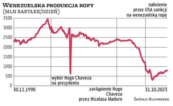 Problem jednak polega na tym, że wenezuelski potencjał do zwiększania produkcji jest kroplą w morzu potrzeb, a to za sprawą wieloletniego zaniedbywania infrastruktury za rządów najpierw Hugona Cháveza, a teraz Nicolása Maduro. Choć Wenezuela niezmiennie cieszy się największymi na świecie rezerwami ropy, to od odnotowanego jeszcze przed dojściem Cháveza do władzy szczytu z lat 90. krajowe wydobycie surowca skurczyło się czterokrotnie.