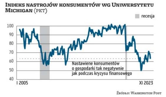 Mimo to specjalista przyznaje, że sygnały z otoczenia rynkowego są według niego mocno niejednoznaczne. Panujące złe nastroje konsumentów historycznie zbiegały się z okresami recesji. Jednak pierwszy raz od wielu dekad towarzyszą one w krajach rozwiniętych nie tylko spadającej od wielu miesięcy inflacji, ale i zwyżkom indeksów giełdowych, rekordowo niskiemu bezrobociu i szybkiemu wzrostowi PKB.
