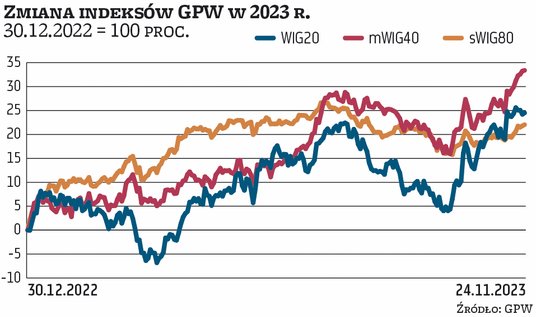W ocenie Świniarskiego można oczekiwać, że w 2024 r. do hossy dołączą mniejsze spółki. Siłą napędową zwyżek w tym segmencie rynku mogą być krajowe fundusze, ale i skuszeni atrakcyjnymi stopami zwrotu inwestorzy indywidualni. – Perspektywa zakończenia restrykcyjnej polityki monetarnej przez główne banki centralne na świecie będzie budowała globalnie pozytywne nastawienie do akcji, co powinno sprzyjać również napływom do krajowych funduszy akcji. Stabilnie rosną aktywa zgromadzone w PPK i PPE, które na koniec listopada przekroczyły już 20 mld zł w każdym z tych programów. Zmiana struktury krajowego PKB z odradzającymi się nakładami inwestycyjnymi buduje płaszczyznę pod wzrost wydajności i wyników spółek. Suma tych czynników będzie sprzyjać wycenom spółek notowanych na GPW, których wartość rynkowa powinna rosnąć nie tylko z uwagi na ekspansję mnożników, lecz głównie z uwagi na dobre momentum wynikowe. Finalnie taki scenariusz będzie przyciągać na rynek inwestorów indywidualnych, którzy generalnie preferują segment małych i średnich spółek – wyjaśnia ekspert.