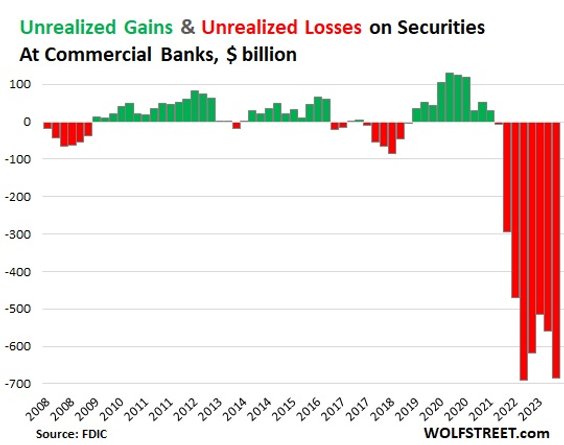 Skumulowane niezrealizowane straty w wysokości 684 miliardów dolarów nie były rekordowe, ale nadal były o 6 miliardów dolarów niższe od rekordu z trzeciego kwartału 2022 r., ponieważ FDIC przejął na początku tego roku trzy banki regionalne i sprzedał ich aktywa, w tym papiery wartościowe, po cenie zbliżonej do wartości rynkowej i w ten sposób pochłonęły straty papierowe.