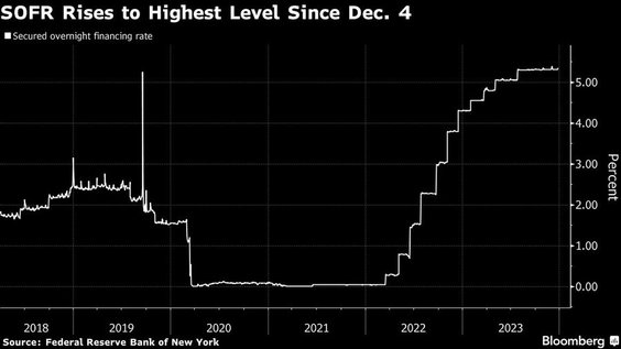 Stopa Secured Overnight Financing Rate, w skrócie SOFR, to stopa referencyjna powiązana z transakcjami jednodniowych umów odkupu. Gdy koszty finansowania rosną, zwykle powoduje to również wzrost SOFR. Według opublikowanych w środę danych nowojorskiego Fed, SOFR ustalono na 5,35 procent na dzień 26 grudnia z 5,32 procent na poprzedniej sesji. To mniej niż rekordowy poziom 5,39 procent osiągnięty 1 grudnia.