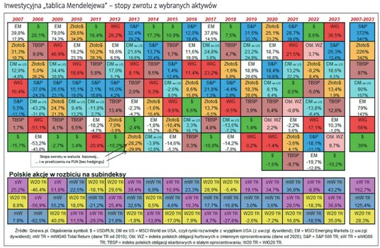 Zgodnie z naszą niepisaną tradycją po zakończeniu roku bierzemy pod lupę inwestycyjną „tablicę Mendelejewa”, czyli barwne, obrazowe zestawienie stóp zwrotu z wybranych aktywów, takich jak akcje z różnych rynków i segmentów, obligacje i złoto. Oczywiście, z natury lista tych aktywów jest mocno uproszczona i w skrócony sposób reprezentuje inwestycyjne uniwersum, ale bez wątpienia skłania do ważnych przemyśleń.