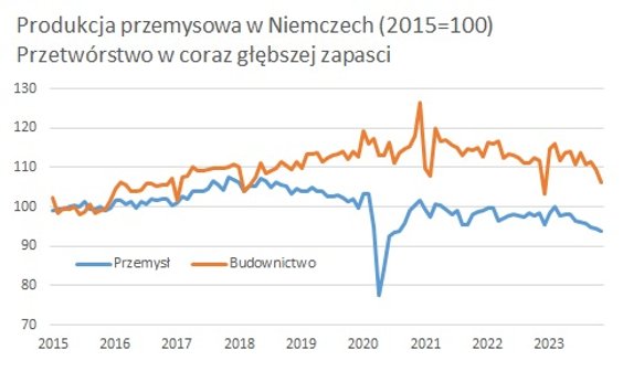 W listopadzie utrzymała się tendencja spadkowa produkcji przemysłowej w Niemczech, co zwiększa prawdopodobieństwo wejścia gospodarki w techniczną recesję. Jak wynika z wstępnych danych Federalnego Urzędu Statystycznego (Destatis), produkcja w przemyśle w ujęciu realnym (po skorygowaniu o ceny) w listopadzie 2023 r. spadła w ujęciu miesiąc do miesiąca po korekcie sezonowej i kalendarzowej o 0,7 proc. W związku z tym produkcja spadła szósty miesiąc z rzędu. Według ekonomistów ankietowanych przez „The Wall Street Journal” listopad miał przynieść zerowy wzrost. Mniej zmienne porównanie trzymiesięczne do trzech miesięcy pokazało, że produkcja w okresie od września do listopada 2023 r. była o 1,9 proc. niższa niż w poprzednich trzech miesiącach. Po rewizji wstępnych wyników produkcja w październiku 2023 r. spadła o 0,3 proc. w porównaniu z wrześniem 2023 r. (wstępnie: -0,4 proc.).