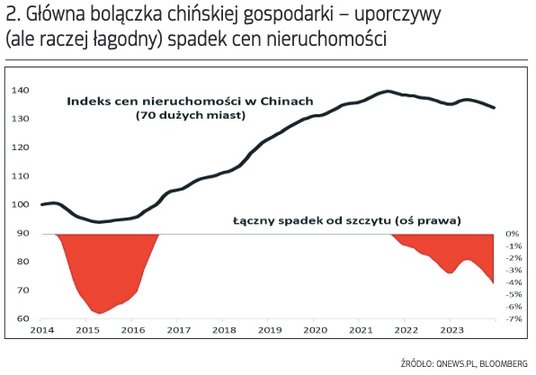 Oczywiście, tak jak to zwykle bywa w takich okolicznościach, słaba postawa akcji w Państwie Środka nie wzięła się znikąd. To odzwierciedlenie kompleksowych problemów, z jakimi boryka się tamtejsza gospodarka. Dokładna ich analiza wykracza poza ramy tego artykułu, ale warto wspomnieć o najważniejszych wątkach. Najbardziej namacalną oznaką trudności jest postępująca korekta cen nieruchomości. Chociaż ich spadek nie jest zbyt silny, to jednak trwa już od końcówki 2021 roku. U źródeł tego trendu leży miks różnych czynników, począwszy od wcześniejszego przeinwestowania, poprzez negatywne tendencje demograficzne (rekordowo niska liczba narodzin w ub.r.), a skończywszy na społecznym kryzysie zaufania wywołanym przez długo utrzymywaną politykę pandemicznych obostrzeń.