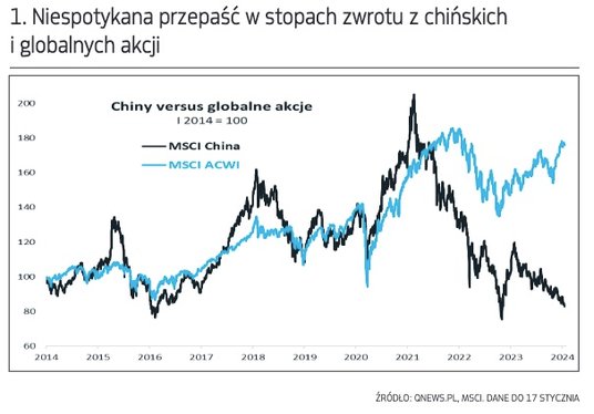Przespanie przez chińskie akcje fali ożywienia trwającej na światowych giełdach od października oraz kolejna zniżka na początku 2024 sprawiły, że pomiędzy MSCI China a globalnym benchmarkiem MSCI ACWI (grupujących rynki rozwinięte i wschodzące) jeszcze bardziej powiększyła się przepaść. Jak pokazujemy na wykresie, przepaść tę można określić na ponad 90 pkt proc.!