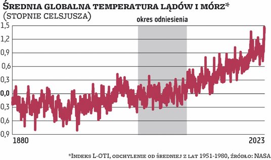 Na koniec spojrzenie na tendencje o jeszcze dłuższym horyzoncie proponuje Adam Łukojć z TFI Allianz. Przygotowany przez niego wykres niestety nie pokazuje żadnego wskaźnika giełdowego, a obliczany przez NASA indeks L-OTI obrazujący zmiany średniej temperatury na Ziemi. Oparty na wysokiej jakości danych zbieranych od 1880 r. wskaźnik pokazuje uśrednione wartości z ostatnich 12 miesięcy, a wyrażony jest w stopniach Celsjusza.