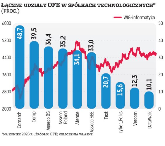 Kilkanaście spółek technologicznych znajdowało się na koniec 2023 r. w porfelach otwartych funduszy emerytalnych. Średnio w jednej spółce OFE miały prawie 25 proc. akcji. Ich największymi faworytami (biorąc pod uwagę udział w kapitale) są Comarch, Comp, Asseco BS, Asseco Poland oraz Atende. Tam na koniec roku fundusze kontrolowały ponad jedną trzecią kapitału. Ale w portfelach OFE znajdziemy też firmy z krótszą historią biznesową i krócej notowane na giełdzie, jak Vercom, Shoper, cyber_Folks, Text, Fabrity czy DataWalk.