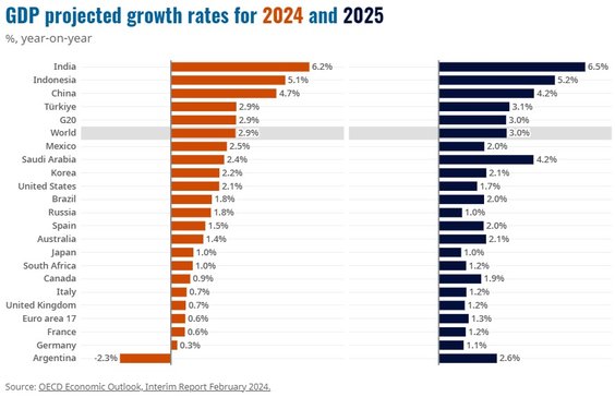 OECD oczekuje, że znaczne spowolnienie w Europie zostanie zrównoważone stałym wzrostem gospodarek wschodzących. OECD stwierdziła, że wśród nich Indie czerpią korzyści z ulepszonej polityki gospodarczej i solidnych inwestycji w infrastrukturę. Przy godnym uwagi wzroście na poziomie 6,7 proc. w zeszłym roku oczekuje się, że w 2024 r. Indie odnotują mniejszą ekspansję – 6,2 proc., a następnie odbicie do 6,5 proc. w 2025 r.