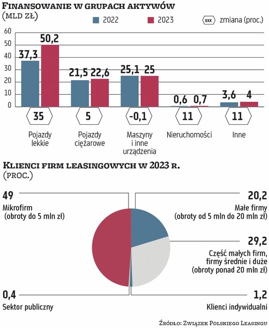 W grupie pojazdów lekkich oddanych w leasing 85 proc. to pojazdy osobowe, natomiast 15 proc. pojazdy dostawcze i ciężarowe do 3,5 tony. Pojazdy lekkie w największym stopniu (60,7 proc.) trafiły do najmniejszych firm o obrotach rocznych do 5 mln zł. Wśród pojazdów ciężarowych leasingiem najczęściej finansowany jest zakup ciągników siodłowych (54 proc.), naczep i przyczep (22 proc.), pojazdów powyżej 3,5 tony (19 proc.) oraz autobusów (5 proc.). Natomiast na rynku maszyn leasingiem najczęściej finansowano maszyny rolnicze (24,7 proc.), sprzęt budowlany (17,5 proc.), maszyny do produkcji tworzyw sztucznych i obróbki metali (12,6 proc.), sprzęt medyczny (5,1 proc.) i maszyny spożywcze (3,5 proc.). Maszyny w znacznie większym stopniu niż pojazdy są przy tym finansowane pożyczką i dominuje tu sprzęt nowy. W 2023 r. nastąpiło zmniejszenie znaczenia sektora mikro w finansowaniu maszyn, ale nadal jest to największy segment (44,5 proc). Nastąpił tu natomiast wyraźny wzrost znaczenia firm o rocznych obrotach powyżej 20 mln zł.