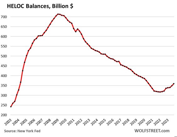 Salda HELOC* wzrosły w czwartym kwartale o 3,2 proc. w porównaniu z trzecim kwartałem, o 7,1 proc. rok do roku, co stanowi siódmy kwartał z rzędu wzrostów, i o 13 proc. w porównaniu z dwoma latami. Zatem HELOC (linia kredytowa pod zastaw domu) na poziomie 360 miliardów dolarów jest nadal historycznie niska, ale wysokie oprocentowanie kredytów hipotecznych zmieniło ten trend.