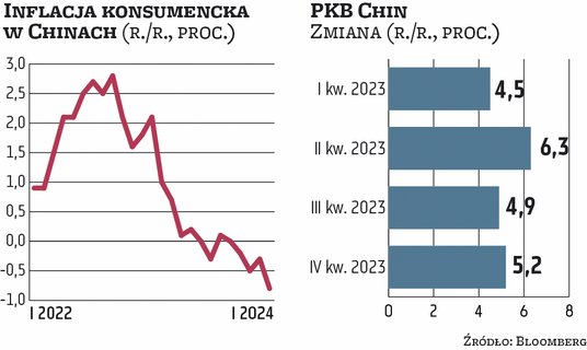 Był on też większy, niż oczekiwali analitycy – średnio spodziewali się, że wyniesie 0,5 proc. Licząc miesiąc do miesiąca, ceny wzrosły o 0,3 proc., a oczekiwano ich wzrostu o 0,4 proc. Spadek cen produkcji co prawda wyhamował z 2,7 proc. w grudniu do 2,5 proc. w styczniu, ale wciąż jest stosunkowo wysoki. Deflacja jest jednym z wielu wskaźników sugerujących poważne osłabienie koniunktury w drugiej po USA światowej gospodarce.