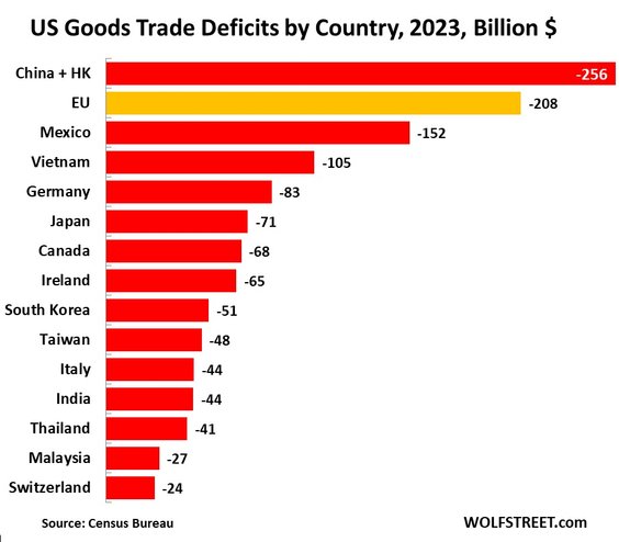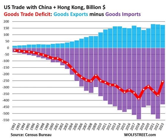Stany Zjednoczone w dalszym ciągu mają największy deficyt w handlu towarami z Chinami i Hongkongiem, które obecnie są traktowane jako jeden kraj. Niemniej jednak w 2023 r. poprawił się do najniższego poziomu od 2010 r. Import zmniejszył się o 110 miliardów dolarów, czyli -20,3 proc., do 431 miliardów dolarów i był najniższy od 2012 roku. Eksport spadł o 4 miliardy dolarów, czyli 2 proc., do 176 miliardów dolarów. W rezultacie deficyt zmniejszył się o 105 miliardów dolarów, czyli 29 proc., do 256 miliardów dolarów.