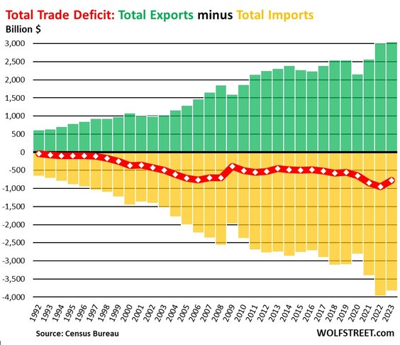 Deficyt w handlu towarami zmniejszył się w 2023 r. Eksport towarów spadł o 39 miliardów dolarów do 2,05 biliona dolarów, import wzrósł o 161 miliardów dolarów, do 3,11 biliona dolarów. W rezultacie deficyt w handlu towarami poprawił się o 121 miliardów dolarów, do 1,06 biliona dolarów.