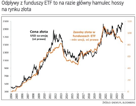 Wiele wskazuje na to, że jednym z najważniejszych hamulców hossy są… uporczywe odpływy kapitału z funduszy typu ETF. Jest to o tyle zaskakujące, że historycznie przepływy były silnie skorelowane z kursem złota. Dziwić się można zatem, że w sytuacji, gdy notowania szlachetnego metalu dosłownie przed chwilą ocierały się o rekord, zasoby złota w posiadaniu funduszy ETF wg wyliczeń agencji Bloomberg są najmniejsze od… czterech lat. W takim tempie mogą niedługo zmaleć poniżej 80 mln uncji, a przecież w szczytowej formie, na jesieni 2020 r., przekraczały 110 mln uncji (wtedy była to równowartość ponad 210 mld USD).