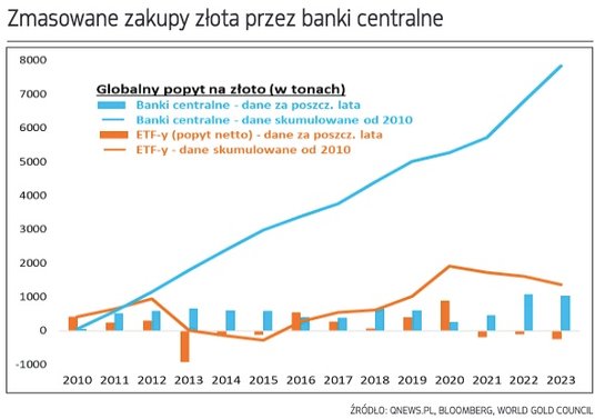 Dane o trwającym „wycieku” kapitału z funduszy ETF znajdują też potwierdzenie w najnowszym raporcie na temat trendów w popycie autorstwa World Gold Council. Każde z ostatnich trzech lat przyniosło podaż złota ze strony ETF (w metodologii WGC mowa o ujemnym popycie netto, czyli różnicy między popytem i podażą). W samym ubiegłym roku stan posiadania funduszy skurczył się o 244 tony (!) przy odpływach netto na poziomie ok. 15 mld USD – podaje WGC. Najwięcej pieniędzy uciekło w 2023 r. z funduszy notowanych w Europie, co zdaniem ekspertów wymienionej instytucji może być konsekwencją rosnących stóp procentowych i coraz wyższych kosztów życia, skłaniających do sięgnięcia po oszczędności.