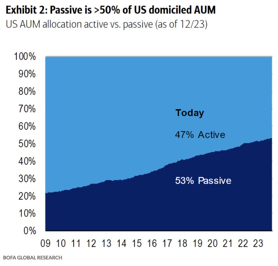 Jak wynika z danych BofA Global Research, ilość aktywów zarządzanych przez fundusze pasywne przewyższyła ilość aktywów zarządzanych przez fundusze aktywne. Dane pokazują, że zaledwie 47% zarządzanych aktywów w USA jest obecnie nadzorowanych przez aktywne fundusze, w porównaniu z 80 proc. w 2009 r.